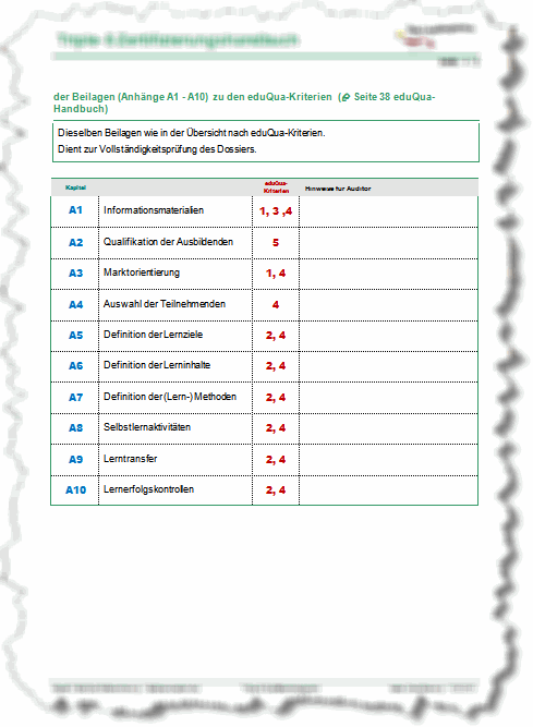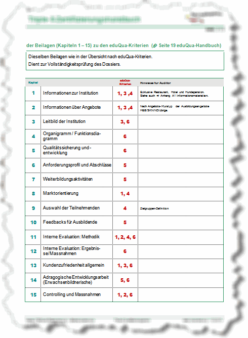 wir bauen mit Ihnen zusammen das verlangte Dossier mit den Kapiteln eins bis 15 nach der eduQua-Norm auf.